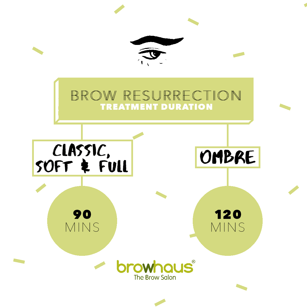 The entire procedure takes 90 minutes for Brow Resurrection Classic, Soft and Full and 120 minutes for Brow Resurrection Ombre to complete, consisting of consultation and the treatment itself.